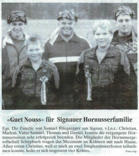 In einer Zeitung war zu lesen: «Gut Nouss für Signauer Hornusserfamilie.» Damit war die Familie Rüegsegger von Bämbrunnen gemeint. Samuel konnte mit seinen vier Söhnen in diesem Jahr das Maximum an Kranzauszeichnungen mit nach Hause nehmen. Allen voran Christian, der deren vier Auszeichnungen in Empfang nehmen durfte.